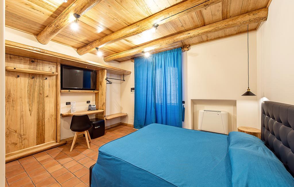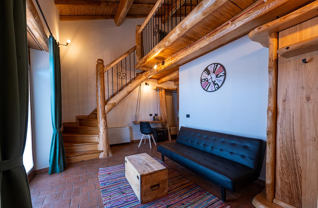 Divided into two areas, day and night, it features a spacious private terrace ideal for moments of relaxation. The day area welcomes guests with a reserved entrance and a comfortable lounge with sofa, while the night area is furnished with a king-size double bed positioned in the upper part, alongside a single bed. In the lower part there is another single bed. The beds are fixed and cannot be moved; an internal staircase allows easy access up and down. Each suite is equipped with an independent entrance with electronic key, private bathroom, and all the comforts of a superior room.
