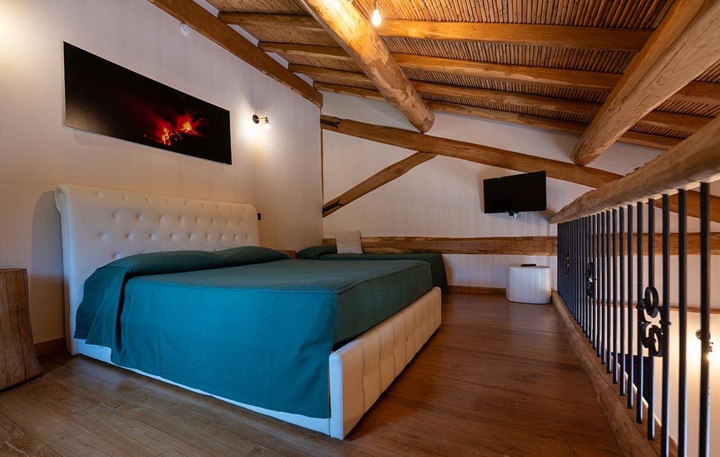 Spacious quadruple room with a view of the monumental garden, ideal for families or groups of friends. Tastefully furnished with attention to detail, it offers a double bed and two single beds, along with all the comforts: TV, Wi-Fi, mini-fridge, telephone, air conditioning, and a private bathroom. Perfect for those seeking relaxation and authenticity in the heart of Mount Etna.